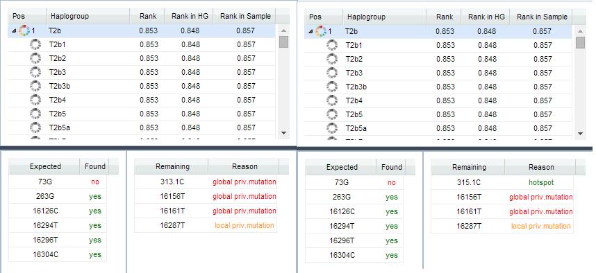 The image below shows, on the left, how the HaploGrep application classifies the variations shown in the table above, with 313.1C described as a "global private mutation". On the right is the same thing with 313.1C replaced by 315.1C, which is described as a "hotspot", that is a very common variation. In both cases, the application ignores this variation when it tries to determine the haplogroup: