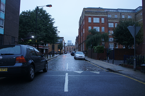 Berner Street crosses where the car on the left side of the road in the distance,( not the one at immediate left of course) is viewed. Notice that I am standing in the middle of the road, Spooner would of course have been on the pavement. I attempted to take a photograph exactly where Spooner would have stood, but from that position Berner Street would have been difficult to point out. Spooner was canoodling with his young woman in the doorway of the Beehive Public House when he was alerted to the murder.