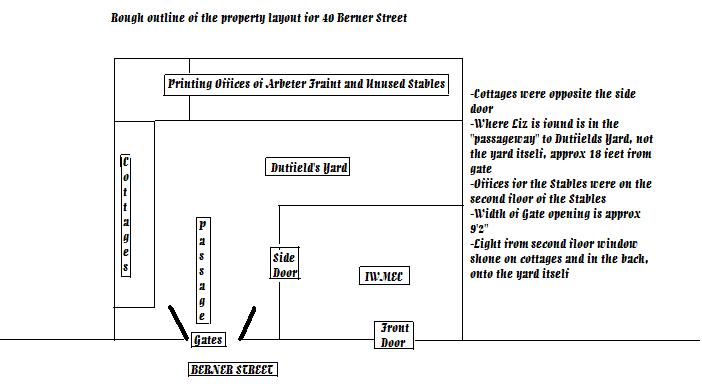 Forgive the interruption... but Ive been following the various discussions since I stopped posting and since Ive discovered today that my profile has not yet been deleted, I thought that some members posting on this thread might like to have a better sense of what was where at 40 Berner Street, based upon some of the more recent assertions. The rough outline is mine, the artful re-creation was courtesy of Jane Coram.