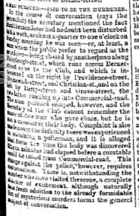 "In the course of conversation (says the journalist) the secretary mentioned the fact that the murderer had no doubt been disturbed in his work, as about a quarter to one o'clock on Sunday morning he was seen - or, at least, a man whom the public prefer to regard as the murderer - being chased by another man along Fairclough-street, which runs across Berner-street close to the Club, and which is intersected on the right by Providence-street, Brunswick-street, and Christian-st., and on the left by Batty-street and Grove-street, the [two latter?] [?] up into Commercial-road. The man pursued escaped, however, and the secretary of the Club cannot remember the name of the man who gave chase, but he is not a member of their body. Complaint is also made [?] [?] [?] there was experienced in obtaining a policeman, and it is alleged that from the time the body was discovered fifteen minutes had elapsed before a constable could be [?] from Commercial-road. This charge against the police, however, requires confirmation. There is, notwithstanding the number who have visited the scene, a complete absence of excitement, although naturally [?] fresh addition to the already formidable list of mysterious murders forms the general subject of conversation."