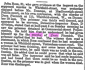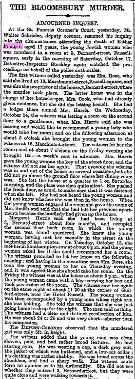 "The inquest yesterday on the woman Florence Hancock added little or nothing to the facts already made public in The Star. We have an apparently trustworthy description of the man with whom the deceased was last seen as "a tall, fair man, with a heavy moustache;" we have also Mr. Pain's word for it that she had on one or two occasions wished she was dead. This, however, comes to little when taken with the general evidence as to her manner and spirits before her disappearance. Mr. Pain says that he gave her no money when he last met her (though here again there is a contradiction in the evidence), and this coupled with the fact of the gold chain being found on her, throws doubt on robbery as the motive for the crime - if crime there was. We still believe that there was, and that this is probably only one more instance where the helplessness of our detective police will be demonstrated."