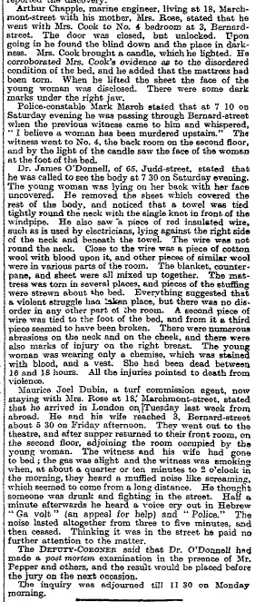 The dairy apparently did not answer, and she removed to a private house, changing about from quarter to quarter as such girls generally do. About a year ago she took the house at 13, Pulross-road, Brixton, furnishing it on the hire system. Here the girl Jennings came to live with her. She and Jennings had been friends for many years. Pain still made her a weekly allowance, which she boasted of as being £5 a week, but there is reason to believe it was not nearly so large. Now we come to the 22nd . On the night before that day she and her servant-girl sat up to a very late hour finishing a new costume, and her mother understood that she expected Pain was going to take her out of town for a holiday. At all events, about four o'clock in the afternoon she left home dressed in brand new clothes from head to foot. She had to meet her friend soon after five o'clock at Liverpool-street Station. She was never seen alive again at her