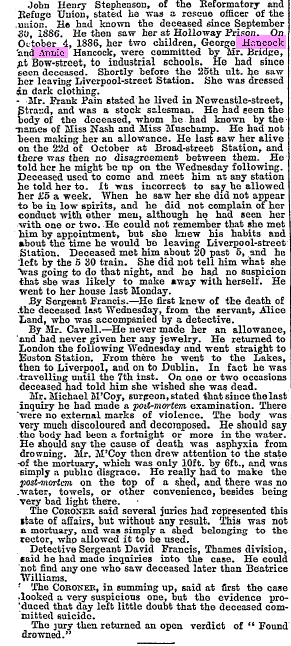 Coroner Baxter held an inquest yesterday at Shadwell, on Florence A. Hancock, aged 26. She was found in the Thames, off Wapping, on Friday last, and her body had been in the water about a week. Up to the opening of the inquest the body remained unidentified, and then a neatly though fashionably dressed young woman came forward and said her name was Maud Jennings, the wife of a ship's steward, and she lived at 13, Puross-road, Brixton, of which house the deceased was the occupier. She had seen a description of the deceased in the newspapers, and identified her by her clothes as well as by a brooch and other articles the deceased was wearing. The deceased was the wife of George Hancock, formerly a bus conductor. She was separated from him, and had since been living under the protection of a gentleman whom witness knew as Mr. Pain, who was connected with the cattle trade. He allowed her £5 per week and usually came to town twice a week. The deceased left home on Monday afternoon, 22 Oct., to go and meet him at King's-cross, and she never returned. Deceased had been seen at Charing-cross, and also at Ludgate-circus, the same evening. She had two children away at school. She had never threatened to commit suicide to witness's knowledge. She was in no trouble, but was of a most lively disposition, and one not at all likely to take her life. The inquest was adjourned.