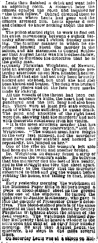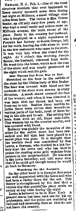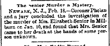 I have done a press search on the site etc and can't find anything about the murder of Elizabeth Senior, the old woman murdered in Milborn, New Jersey. Was wondering if anyon has any info as I wanted to look into it more.