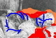 Of course- The blue lines were some of the IMHO huge cuts that allowed a large amount of blood to flow (Of course the severing of the carotid artery may have added some decoration to the room /partition [whether in alphabetical form is open to dispute!!]--and certainly was number one reason for death!!)-- and more than likely saturated any hair that was left----of course 'chummy' may have given Mary a haircut at some point as well.. a trophy maybe??