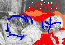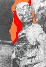 OK looking at THE picture...I see the pieces of Mary's hair that may have been recognisable (Her hum) as being some sort of gingery/blonde...ORANGE in my clumsy Paint rendition - and the (Most) of it blood soaked/stuck to the body....most certainly on her back)...the RED bits- as 'Ears/Hair and Eyes' always appear to be a tad spurious IMHO at the end of the day- the pile of what was left of 'Mary' was well female without a doubt but aside from that..