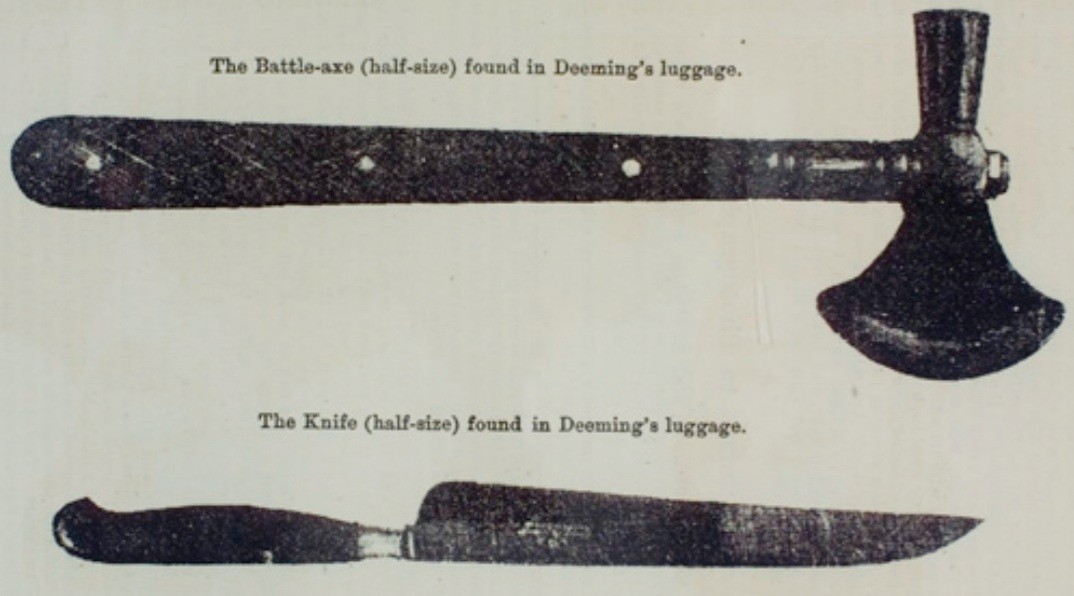 There was no axe or hatchet found in the room. Nick Warren's suggestion that one may have been used was based on MJK2 from the wall behind her bed showing the inside of her left leg and what appeared to be the rough outline of a split femur (just below what was highlighted in the posts above.) What looks like a split femur bone is actually the folds of her chemise and/or bedding sheets.