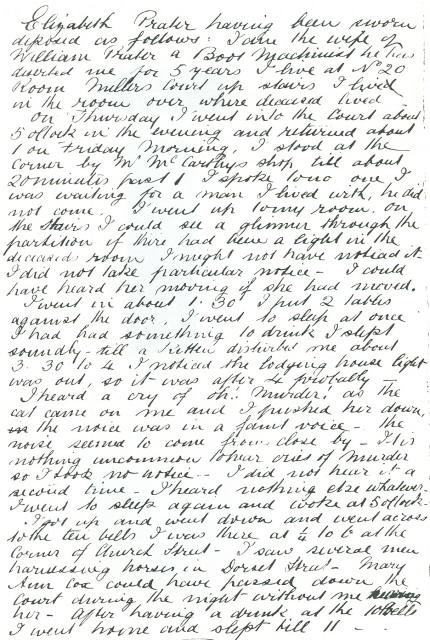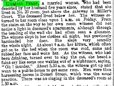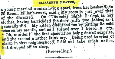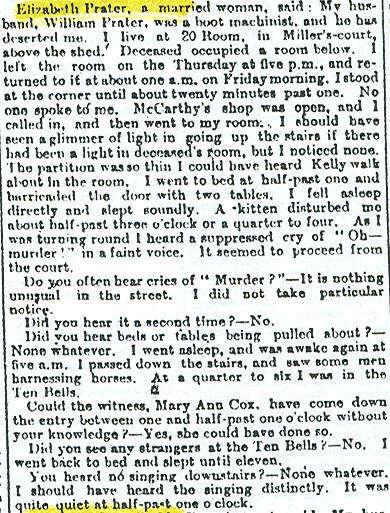 I see that the old debate has cropped up again. I don't intend to get involved but I do understand the arguments on both sides here. I would merely note that newspaper reports dated 10 November 1888 tend to contain more errors than the later ones. Here is Prater's inquest testimony as recorded in The Star -