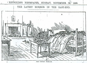A November Police illustrated news illustration also shows the washstand in exactly the same position as the Reynold's sketch too, behind the headboard, although I guess one sketch could have been copied from the other.Originally posted by Sam Flynn View PostThe illustration in Reynolds' News (I think it was - don't have it to hand) shows the disused washstand behind the headboard, occupying the space between it and the wall. This explains why the head of the bed wasn't flush against the wall - the washstand was "pushing" it towards the middle of the room.