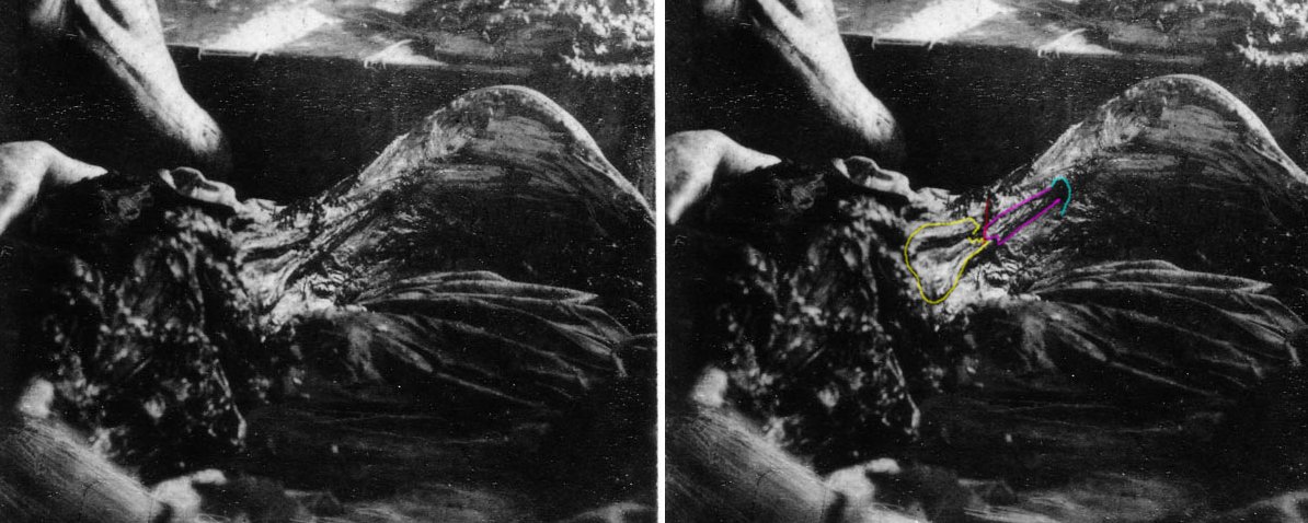 For what it's worth, I think that the "split femur" is an artefact produced by some blood-soaked rucks in the bed-linen.