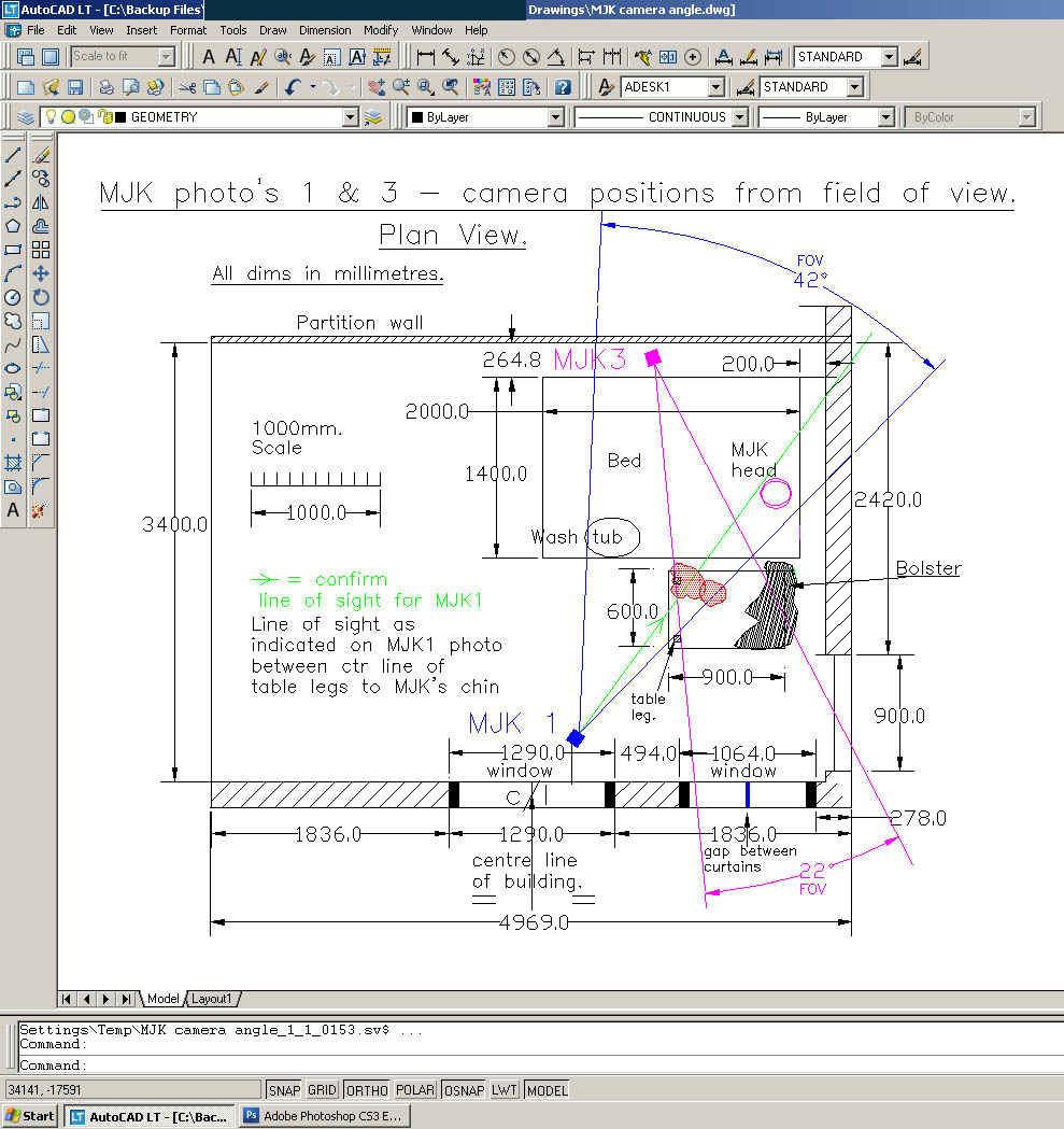 The field of view (FOV) of those two photos, MJK1 and MJK3, are used to place the positions of where the camera was likely to be to capture each photograph.