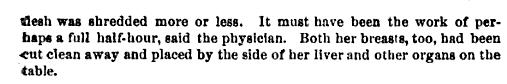 There were newspaper reports, the Daily Telegraph 13 November for example, which did actually state that some “bodily organ” was missing while the Observer, 18 November, stated flat out that the killer “cut the woman’s heart out and carried it away.