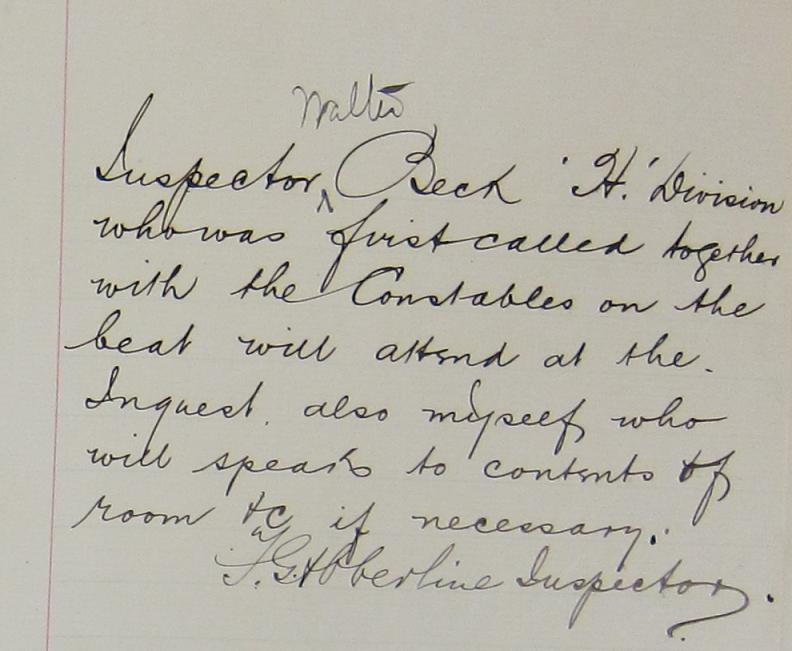 Here's the end of the police statements, which look to me to be in all the same hand with the exception of Elizabeth Prater's. The inclusion of 'Walter' above 'Inspector Beck' is in Macdonald's hand.