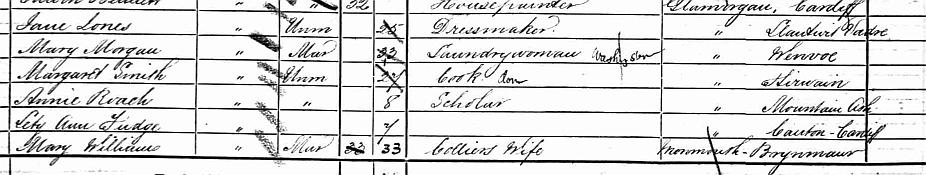 The stay of Kelly in the Cardiff Infirmary COULD just have coincided with the 1881 census. This depends on many speculative dates. IF Kelly was 25 when she died she would have been born about 1863. IF she married, as Barnett states, when she was 16, this would have been about 1879. IF the marriage lasted somewhere about 1 to 2 years then Davies could have died in the colliery explosion in 1880 or 1881. IF the widowed Kelly then went to live in Cardiff with her cousin and stayed in the Infirmary this could have been in 1881.