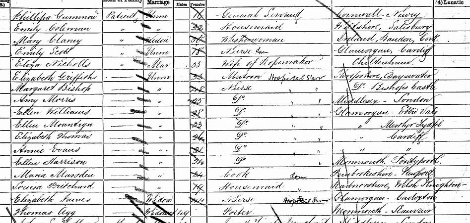 A long time back I found the 1881 records for the main Cardiff infirmary and listed them, but there was, as far as I remember, no promising looking record.
