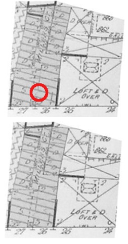 I'm not sure that they did, Stephen. It appears that the side-door to the upper floors was more "aft" than one might imagine, if I read this rather low-res segment of the Goad plan correctly. See the red circle on the top segment and compare it with the original image beneath: