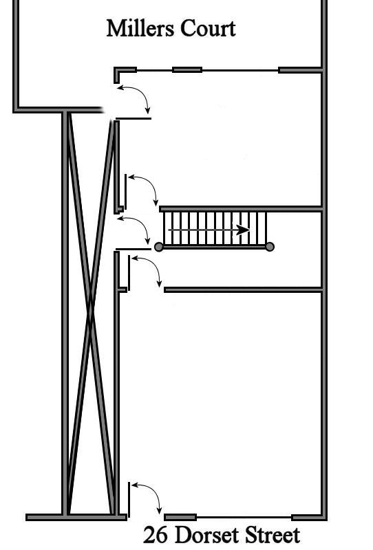 I use to work in a place in Knightshill which had a similar layout. I don't know how old the building was but it had outside toilets. Anyway, you had the shop entrance, there was a door that lead to the upstairs rooms and a door to the kitchen. There was also a door around the side that accessed the stairs and a door around the back that lead to the back garden and to the toilets. So I think 26 Dorset Street originally looked like this, and the partition was just the two inside doors close to the stairs.