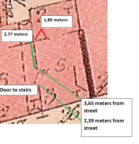 Today I was working on a new model basing it, in part, on Pierre's map and measurements. I too got the door width as 4'2" which I also thought was very wide for a door. Also the door symbol on the map suggests an outward opening door. Most doors open inward (like the door to No. 13). I was going to post as much but I thought I've already made an arse of myself with the totally wrong version model. I thought I'd keep quiet and and wait it out. On that map I cannot see the door to No13.