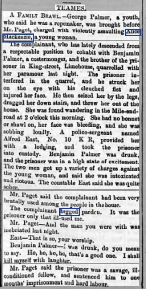 ‘Mrs. Elizabeth Egan, 5, Spencer-street, Everton, Liverpool, writes to us: “In your edition of the 20th July I noticed that the unfortunate woman Alice Mackenzie, lately murdered in London, is supposed to have belonged to Peterborough, and my father’s name is mentioned in connection with the affair. As the only child of the late Mr. John Mackenzie, Trinity-street, formerly South-place [Peterborough], I wish to state that as far as my knowledge goes she was in no way connected with the family.”’