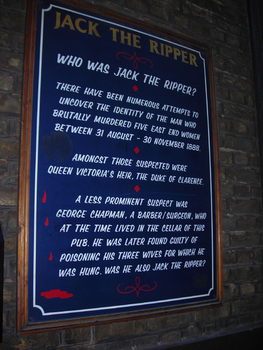 "Who was Jack the Ripper? There have been numerous attempts to uncover the identity of the man who brutally murdered five east end women between 31 August- 30 November 1888. Among those suspected were Queen Victoria's heir, the Duke of Clarence. A less prominent suspect was George Chapman, a barber/surgeon, who at the time lived in the cellar of this pub. He was later found guilty of poisoning his three wives for which he was hung. Was he also Jack the Ripper?"