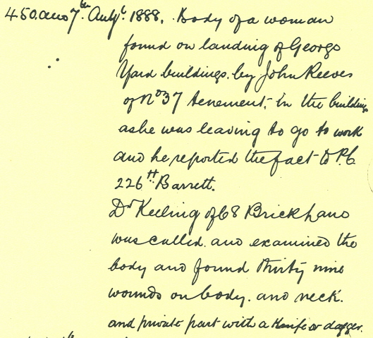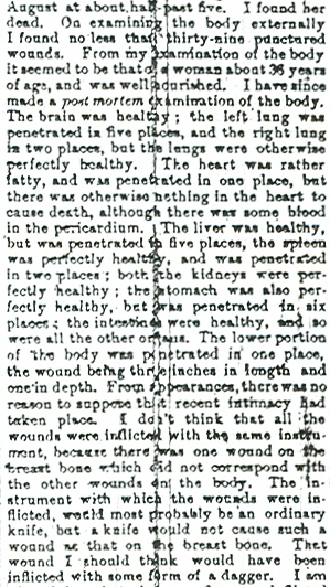 So your point is taken... but it is still unclear. The fact that the papers omitted certain aspects of Killeen's testimony is problematic here. The fact that the Advertiser wrote ""Dr. Keeling then described where the wounds had been made" is interesting, since this part of his testimony apparently related to his description of the wound or wounds in the "lower portion of the body."... (ie. he had already detailed the location of the 21 wounds in the torso.)