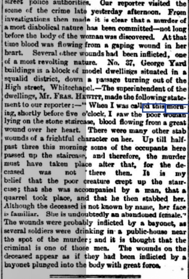 Another quote showing the police were considering soldiers:About four o'clock yesterday morning a woman was found in George-yard, Whitechapel, stabbed to death. There were twenty-four wounds in various parts of her body.