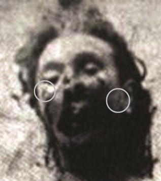 The crosses highlighted could have been created when a stitch was applied to the cut but if you follow the cut lines from the bridge of the nose to the cheek they follow an almost diagonal path thus in my opinion adding more weight to the knife wielding angle rather than precise cuts.