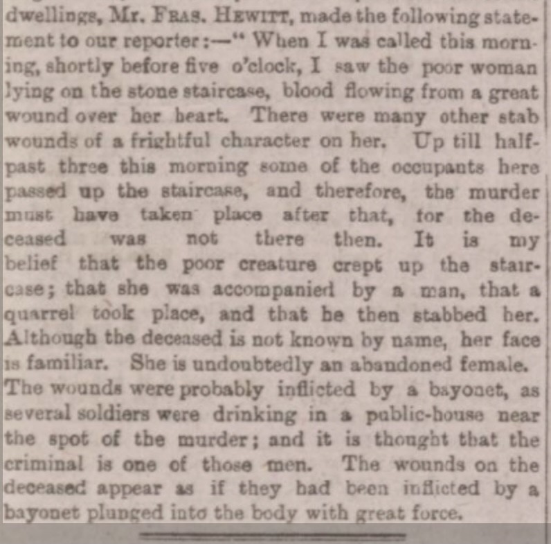 A few hours after the discovery of Tabram’s body, Francis Hewitt was regaling a reporter from the Sheffield Evening Telegraph with tales of soldiers and bayonet wounds.