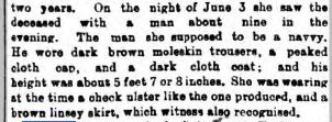 "Jennie Lee, of 14, Turks-row, said she had known the deceased Lizzie Jackson two years. She confirmed the former evidence as to the destitution of the girl. Witness last saw her on the Monday before Whit Sunday, and she was then with a man who had on light moleskin trousers, dark cloth coat, and a rough cap, and she thought he was a navvy. She was wearing the check ulster and skirt produced, and went away with the man to Battersea."