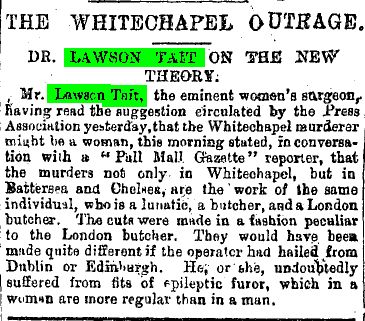 I am curious as to who this Lawson Tait is and why a gynecologist would get involved and what made him suspect that the murderer was, of all things, a woman? it is also interesting in that we now know that William Druitt and Robert Druitt specialized in obstetrics.