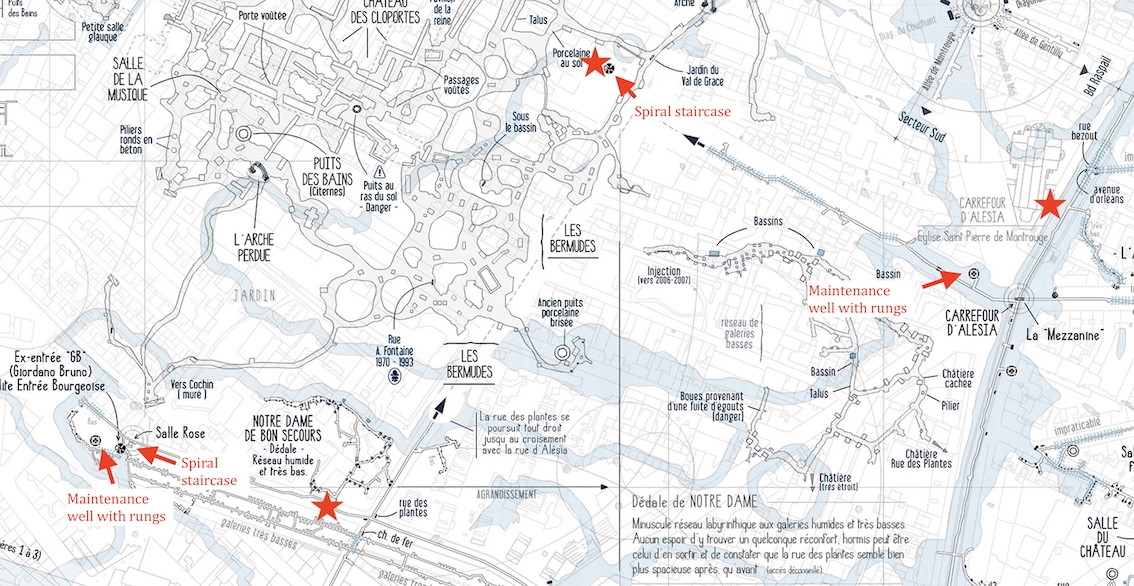 However, your message caught my attention, and I went to dig through my (unofficial) maps of the catacombs. There are some very detailed ones created by “cataphiles” (urban exploration enthusiasts). They have catalogued the current access points to the underground quarries in the districts south of the Seine (Left Bank). The result is clear: the three sites where the body parts were found are all in close proximity to a "service shaft with rungs", meaning one of the access points to the catacombs.