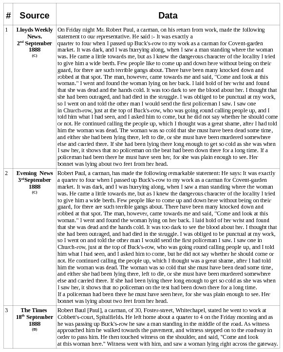 This information is present over the following pages as a series of tables, one for every named individual in the case. Each table lists a number of different sources. Each separate source is given a reference to allow for easier discussion.
