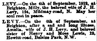 The death of Amelia Levy was registered at Brighton in the third quarter of 1912 (aged 70). She was buried at Plashet Cemetery on 6 September 1912.