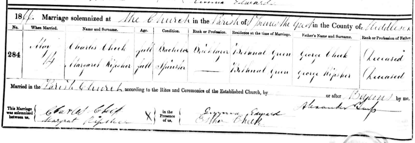 Wife: Margaret Cheeks aged 32 born Bethnal Green