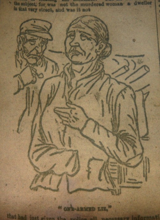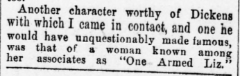 Another character worthy of Dickens with which I came in contact, and one he would have unquestionably made famous, was that of a woman known among her associates as "One Armed Liz."