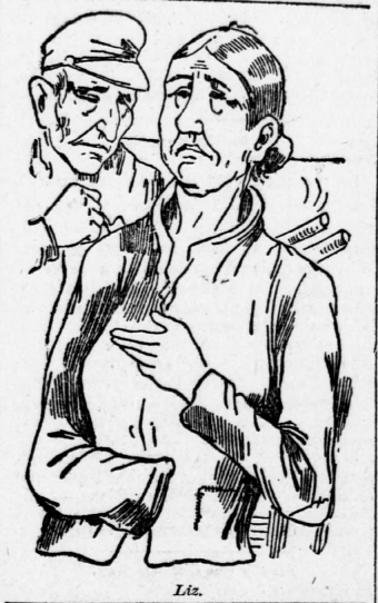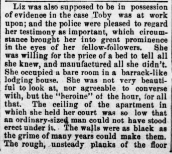 Attached below are crude drawings of Toby and One Armed Liz and also a fuller version of Liz's story which I had not previously seen. The sketches and text are from the Pittsburgh Dispatch of 13 July 1889, from a story called "The Abode of Crime"