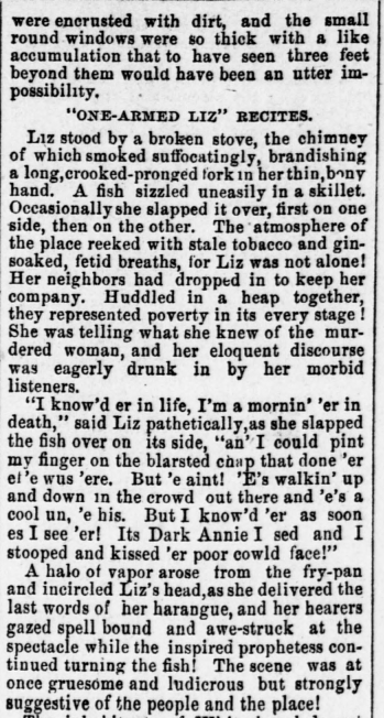 The inhabitants of Whitechapel do not seem to have any particular occupation. The men loaf in the public houses, and the women parade up and down the streets. Most of them are known to each other by nickname only. Little heed is given their comings and goings. They may disappear from their accustomary haunts without being missed. The taking off of one, more or less, is a matter of little importance. The women are, if possible, more depraved than the men. If they have 4 pence they purchase a bed at night, if not they sleep in doorways or sheds. The thoroughfares of this district are infested with drunken ruffians and thieves, but the shops are brilliantly lighted and the passersby careless to a degree. Police in uniform and plain clothes patrol the bets; churches throw open their doors and ring out a welcome invitation, to which those invited do not respond. No one lays claim to being better than his neighbor. All are waifs of the same streets; frequenters of the same vile resorts; companions of the same malefactors; living the same dissolute lives, dying the same horrible deaths. The ignorance among this herd of humanity is almost savage - even the higher instincts and sensibilities of the brute are lacking. Superstitious, untaught, evil minded, they attribute their ups and downs in life largely to supernatural agencies, and nothing could induce them to "pal in" with none who had the "evil eye," even though (to express it in their own vernacular) he was spending the "swag" of a successful "bust," which, I take it, means well supplied with ill gotten gains.