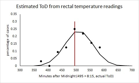 What I've done is start at 5:45 am, and then set cut offs every 30 minutes (so, 5:45-6:15; 6:15-6:45, etc), and I just count how many of the 32 cases are in each of those 30 minute time windows. (Time is shown as "minutes after midnight", so 300 would be 5:00 am). The actual ToD is 8:15, and as we can see, the estimated values show a wide range, indicating that even under optimal circumstances, body temperature does not provide anything other than a wide window of estimates. The filled circles are the actual data, the solid line is a normal distribution based upon the mean and standard deviation of the sample (and basically, it looks like estimated ToD is normally distributed). The black series is for the readings taken at 2pm and the blue for the series taken at 4pm.