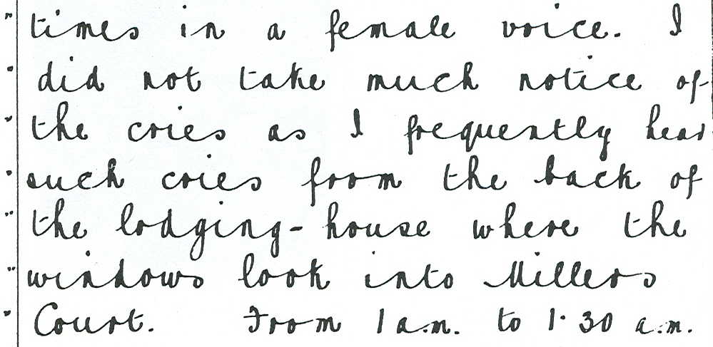 Whilst I can see where Gareth is 'coming from' and that he has raised a valid point, it is far from a proven point as some here seem to indicate. Prater's written statement made on the 9th November 1888, however, is a totally different 'piece of paper'. The interesting thing, of course, is that Prater clearly refers to the lodging house from whence she "frequently heard such cries" and those cries came from "the back of the lodging-house where the windows look into Millers Court." And that simply cannot be the lodging house on the opposite side of Dorset Street to No. 26.