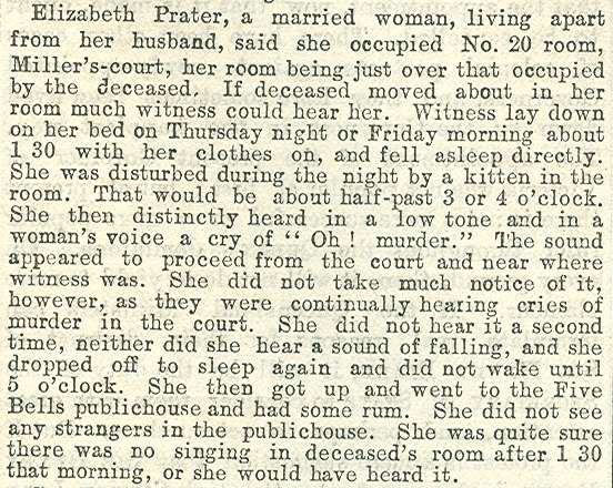 'Elizabeth Prater stated that she lived in no. 20 room, just above the gateway in Miller's Court. The deceased lived below her.'