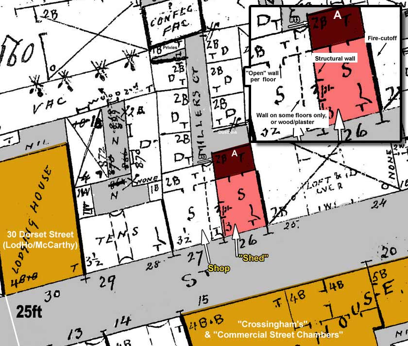 Im basing my guesses on the assumption that the doorway now blocked by what appears to be an old door for the Dorset Street frontage...there is what appears to be faded 2 and 6 on that wall section...entered a hallway that accessed the stairs Mrs Prater uses, or perhaps a kitchen if turning left down the hall?