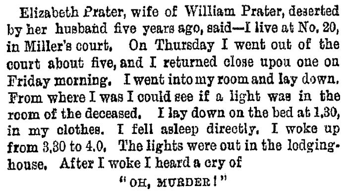 The Star, 12th November: Elizabeth Prater, a young married woman living apart from her husband, in 20 Room, Miller's-court, said: My room is just over that of the deceased.