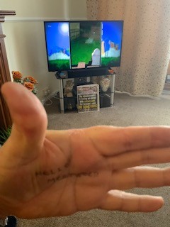A photograph of my hand with ‘Hello Meetwood’ written on it in front of a TV with You’ve Been Framed on and a copy of todays Daily Mirror in front of it.