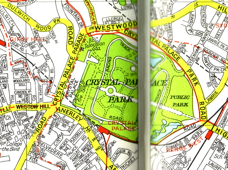 In fact here's a map of the park showing the outline of the Crystal Palace and Westow Hill. The white area behind the Palace is the famous Crystal Palace athletics stadium, which for 30 odd years has been the grottiest major stadium in Western Europe.
