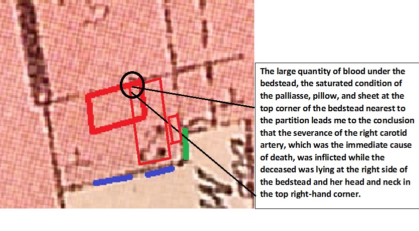 He then refers to the amount of blood at the corner of the bedstead nearest the partition and that death "was inflicted while the deceased was lying at the right side of the bedstead".