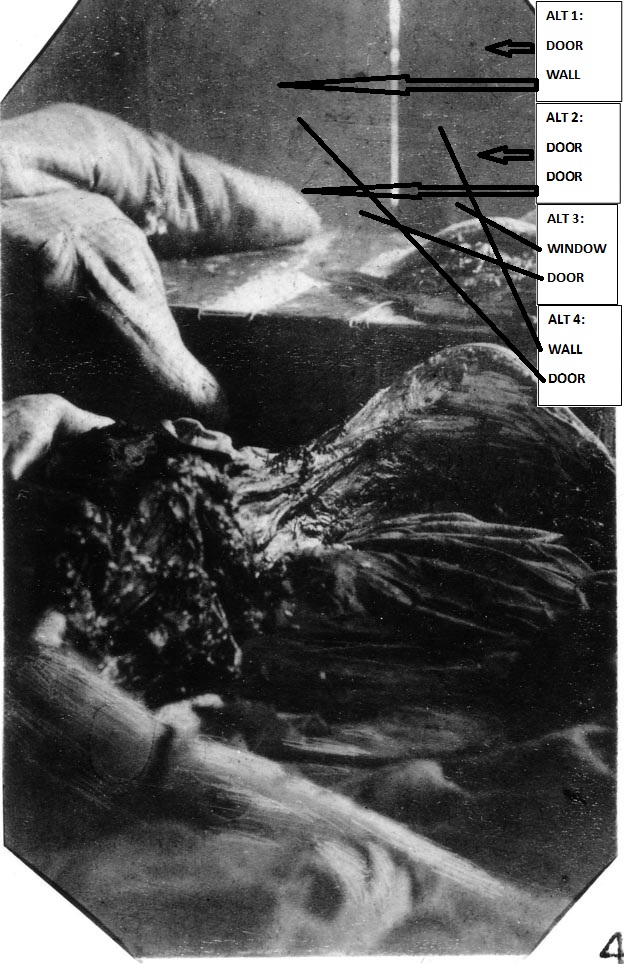 [MJK3 ANGLE] in the mjk1 photo, mary kelly has bundle of covers by her right calf. Lets say that you have taken mjk1 and have moved to the opposite sideof the bed. There is a space between the bed and the wall, and you position your camera next to the bed and at a height slightly higher than that bundle of covers. You angle your camera towards the corner between the door and the broken paned window; so now, in your frame, you would be looking across Mary Kellys pelvis, the bedside table AND also see the door and window. I am saying that this how MJK3 was taken.