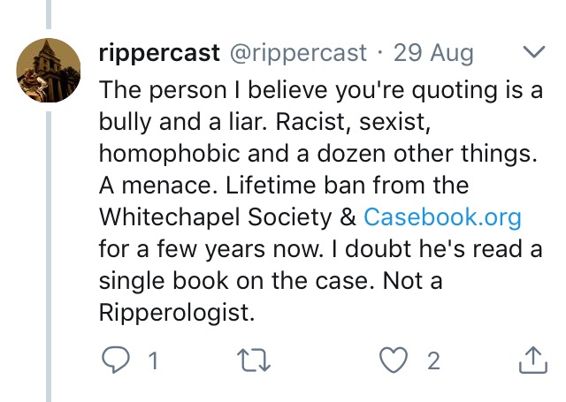 As it stands on Twitter I'm racist, sexist, homophobic etc and haven't read a single Ripper book. Not my 'suggestions', your words. Please put that right.