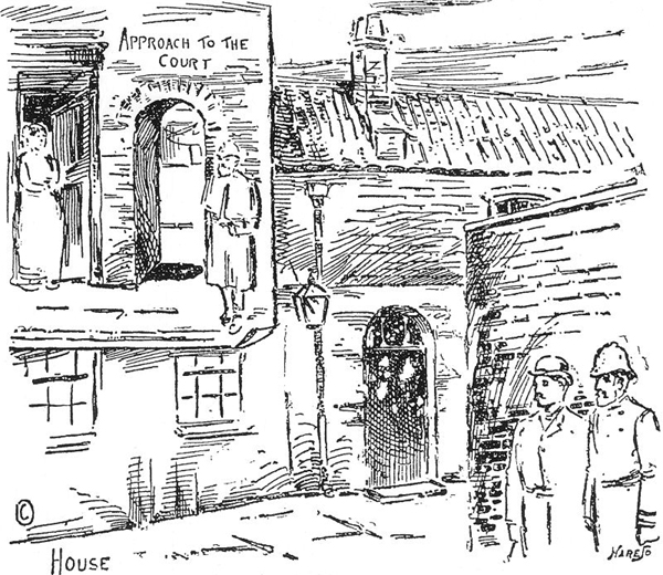 The image below depicts the three houses on the right (looking from the court entry arch toward the privy). Can someone confirm the window and door configuration?