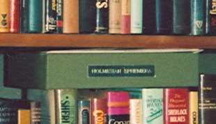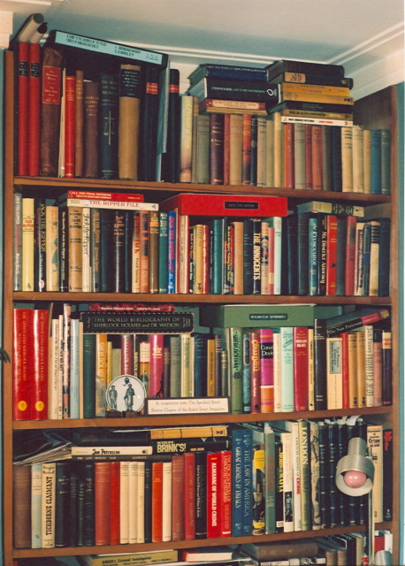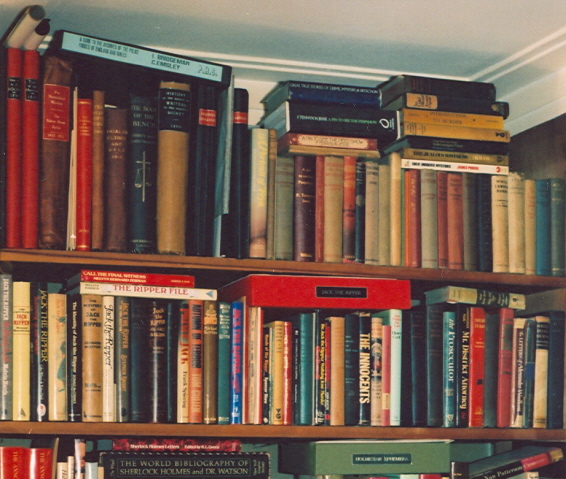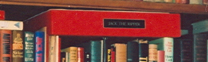 Many Ripper aficionados are also bibliophiles. It was mainly my interest in the subject of Jack the Ripper that led me into the collecting of non-fiction crime books. Early inspirations for me in this this collecting were provided by the great crime historians Richard Whittington-Egan, Jonathan Goodman and Colin Wilson. I was reminded of this recently when I discovered some photographs that I took when I first visited the late Jonathan Goodman many years ago. Below is a shot of the bookcase that contained his collection of Ripper books and ephemera - but what is in that large red box, lying on top of the books, with a black label with gilt lettering 'Jack the Ripper'? I don't recall looking a minor mystery indeed.