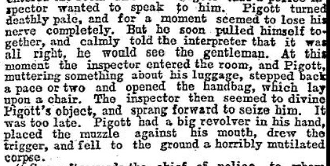 Remember all those stories about Pigott agreeing to go off with the Spanish inspector, but having to return to his room to collect his hat/business cards/coat, after which a gunshot was heard and there he was laying on the floor, dead?